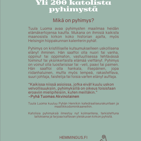 Tässä kirjassa maallikkodominikaani ja seurakunta-aktiivi Tuula Luoma avaa pyhimysten maailmaa 229 henkilön elämäkertatietojen kautta kahden vuosituhannen ajalta kaikista maanosista. Kirjassa ovat Helsingin katolisen hiippakunnan kalenterin pyhät sekä suuri joukko muita.
