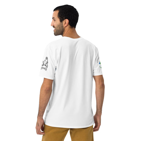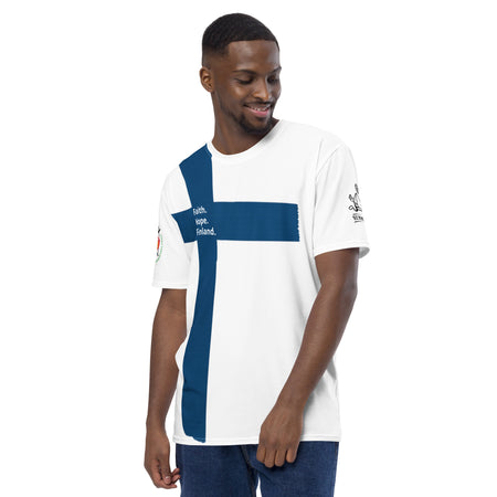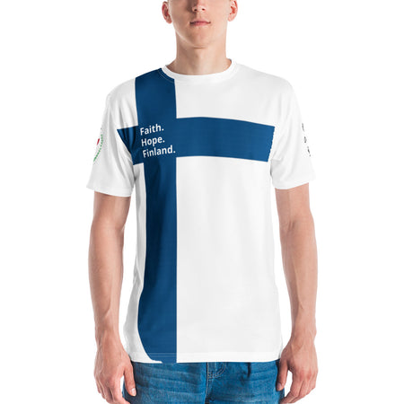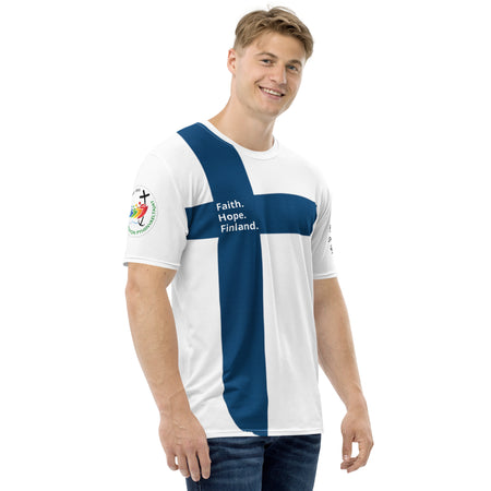 Etupuolen suuri siniristi kertoo, mistä tulet ja mitä kannat sydämessäsi. Toisessa hihassa on Toivon pyhiinvaeltajat -logo Riemuvuodelta 2025, toisessa Hemminguksen sympaattinen tunnus.
